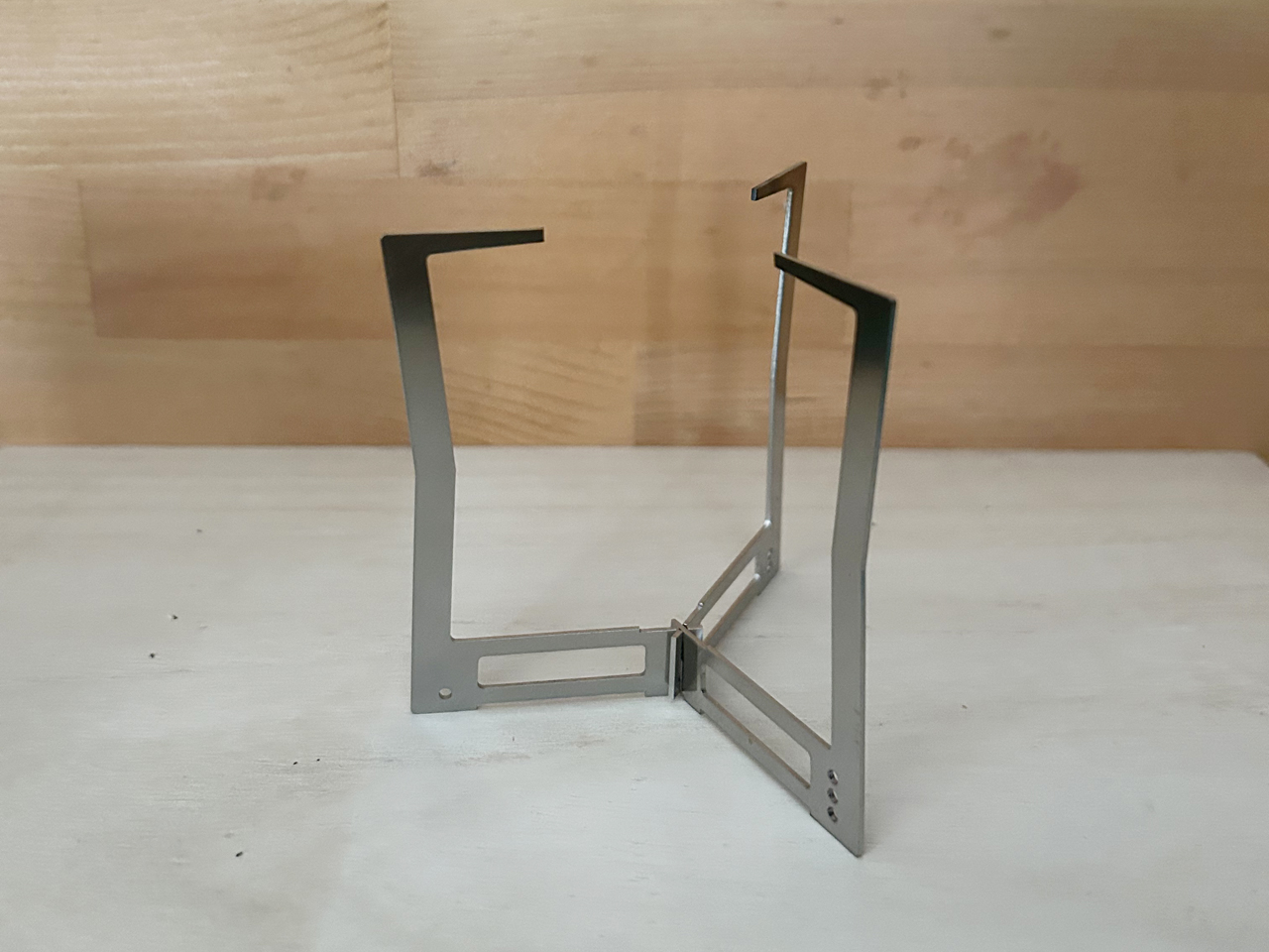 しかしその分平面構造の3PCを組み上げる仕組みの開発には苦労しました、アウトドアでの使用を考慮すると複雑な組み立て方法にしたくは無いのですが、一般的に考えられるフレームを曲げながら差し込むやり方は弾性が乏しい厚さ1mmのチタン板には使えない方法です、また450mlカップ内に収納出来るサイズにするためには3PCを結合する部分を1箇所にまとめる必要があり新たな結合形状を開発しました。