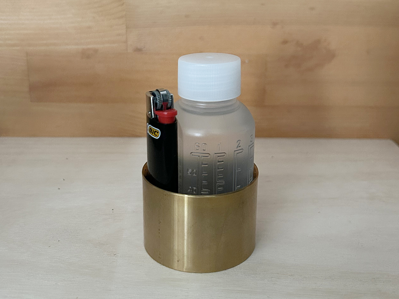 RSRストーブの中にプラボトル60mlを入れ残った隙間に収納します、Bic J23の断面が楕円形なのはこのために設計されたのではないかと思うほどにジャストフィットします。同形状で背が低いJ25もありますが容量と持ちやすさを考慮するとJ23に軍配が上がります。