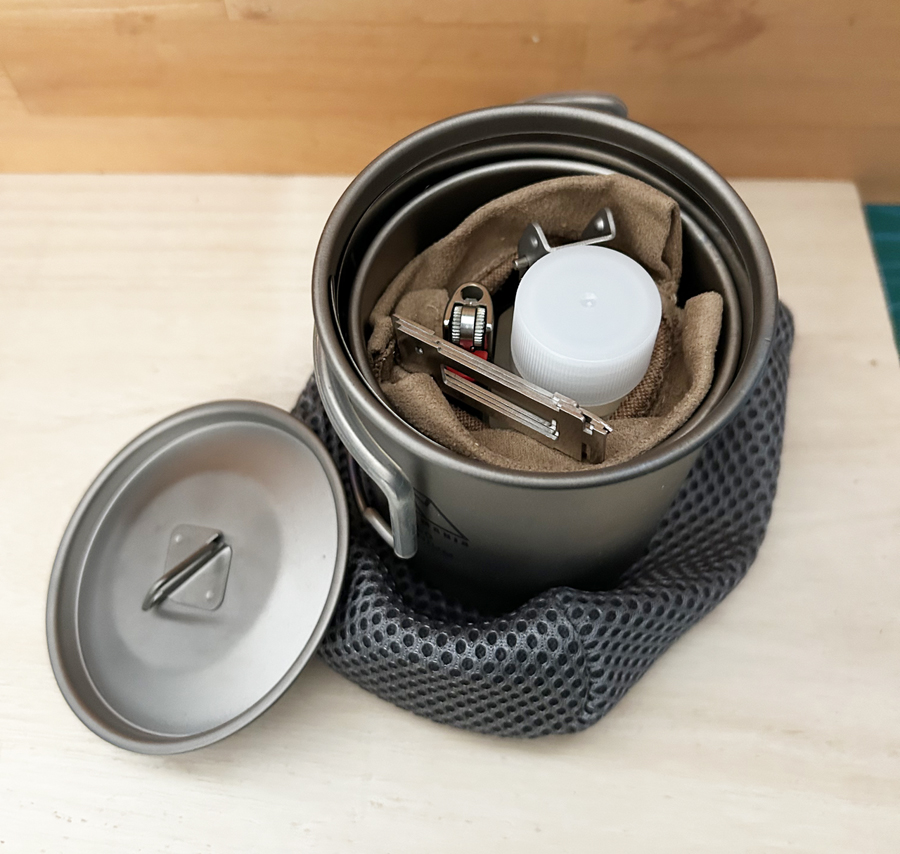 マグカップとしては少し大きいのですが主な用途は鍋でありこの中に全てが収納出来るケースだと考えるとミニマムサイズだと思います。アウトドアギアに関する記事でチタンは軽いという記載をよく見かけますが実はチタンの比重はアルミと比べると1.6倍ほど重く熱伝導率も悪いです、しかし強度がアルミの3倍ほどあり薄く伸ばして使うことが出来るので結果的にアルミのギアより軽い製品化が可能で熱伝導率の悪さもカバーできるのです。
