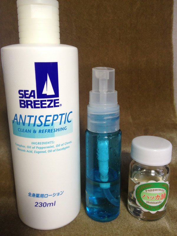 山歩きしていると当然激しく汗をかく、すると顔の周りに小さな虫がうるさく飛び回って不快。そんなときに ハッカ油+シーブリーズ のブレンドを小さなスプレーボトルに入れ、シュッシュッとやる。虫は居なくなるし、火照った顔も涼しくなり、息苦しさも軽減される。渓歩きの達人に教わった名案。