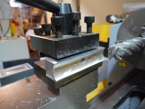 この状態で横送り台のハンドルを回すと7度にテーパードした切削が出来ます。