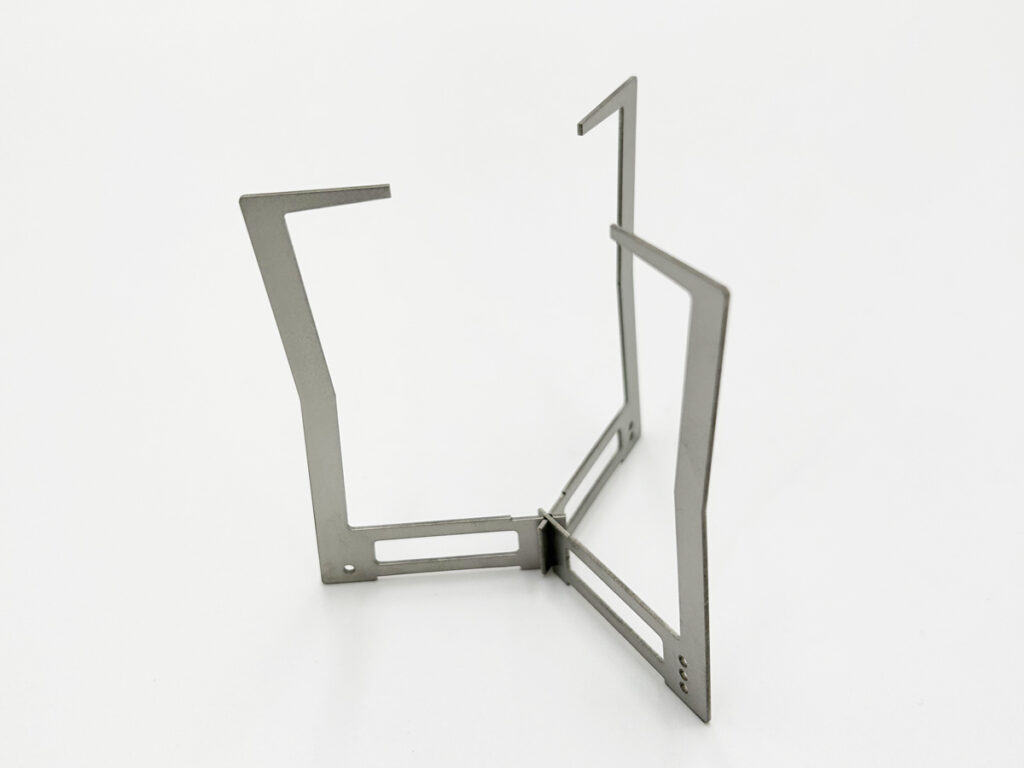 しかしその分平面構造の3PCを組み上げる仕組みの開発には苦労しました、アウトドアでの使用を考慮すると複雑な組み立て方法にしたくは無いのですが、一般的に考えられるフレームを曲げながら差し込むやり方は弾性が乏しい厚さ1mmのチタン板には使えない方法です、また450mlカップ内に収納出来るサイズにするためには3PCを結合する部分を1箇所にまとめる必要があり新たな結合形状を開発しました。